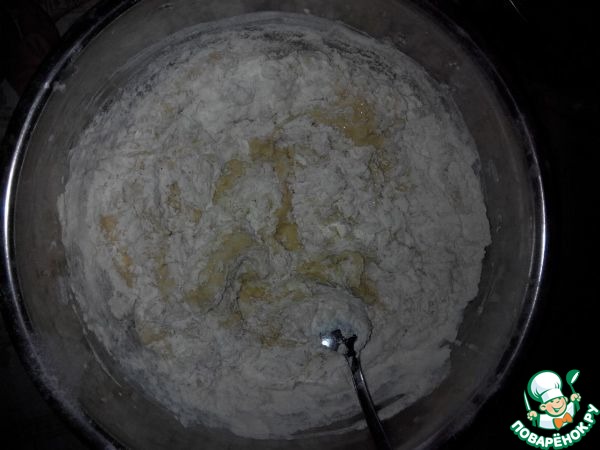 Добавить к дрожжам все ингредиенты + растопленный маргарин.