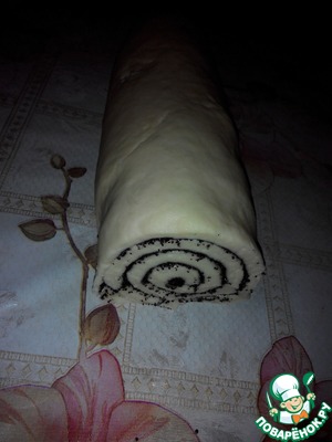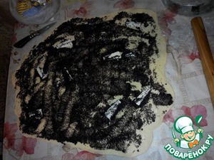 Тесто раскатать в пласт примерно 5 мм, тонко выложить начинку (я ещё клала тоненькими брусочками сливочное масло)