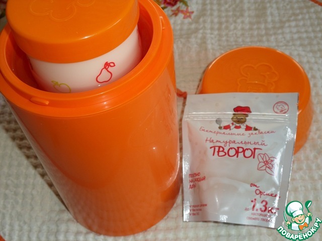 В термос наливаем кипящей воды до указанной отметки. Помещаем в термос ёмкость с молоком и закваской. Закрываем термос крышкой и убираем на 8-10 часов. Аналогично делаем творог из еще одного литра молока.