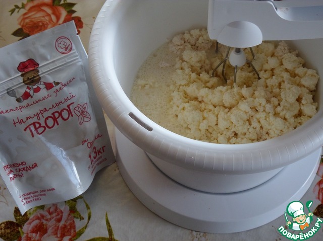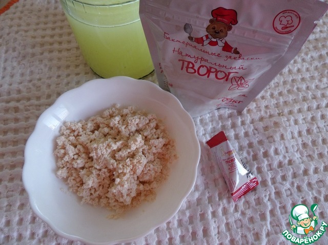 Для приготовления запеканки нам потребуется творог. Его мы приготовим из молока и закваски. В ёмкость наливаем 1 л молока комнатной температуры, добавляем закваску. Закрываем ёмкость крышкой и встряхиваем в течении 2-3 минут.