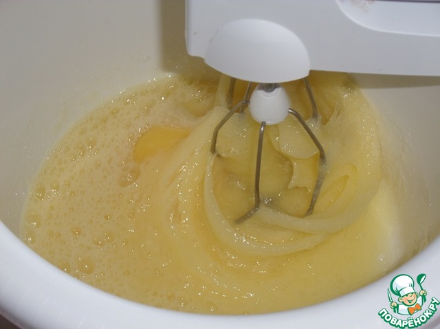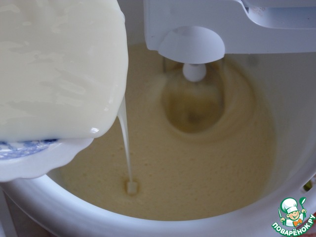 Затем добавляем сгущенное молоко. Продолжаем взбивать.