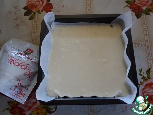 Выливаем творожную массу в глубокую форму для запекания, застеленную пергаментом. У меня форма размером 21х21 см.