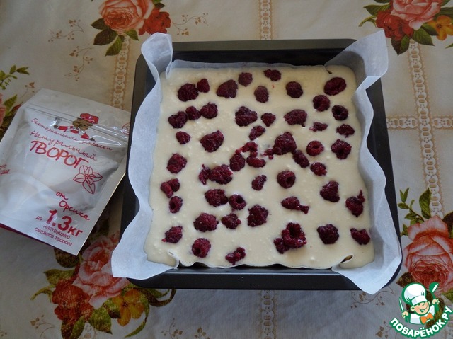 Добавляем 100 гр малины, слегка вдавливая ее в творожную массу. Помещаем форму в разогретую духовку.