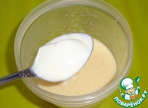 Потом в тесто добавляем термостатный йогурт. Перемешиваем миксером до однородности. За счет йогурта получаются мягкие и воздушные кексы.