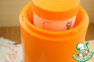 В термос-йогуртницу налить крутой кипяток до отметок, поставить емкость с подготовленным топленым молоком и закваской, термос закрыть и убрать в теплое место на 6-10 часов.