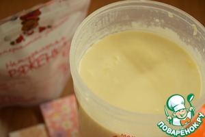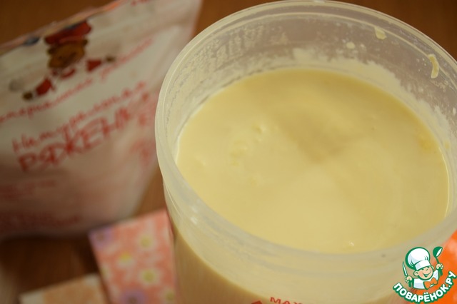 Приготовим ряженку: домашнее топленое молоко (22-24°С) вылить в емкость, в которой будем готовим ряженку, добавить 1 пакет закваски для ряженки от Орсика. Емкость хорошо закрыть крышкой и поболтать из стороны в сторону 2-3 минуты.