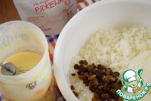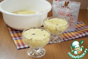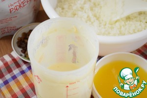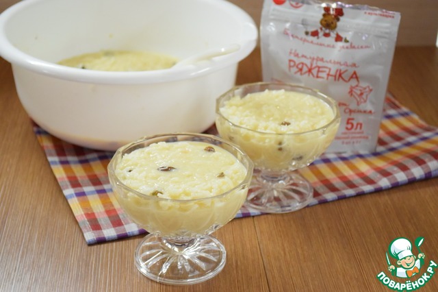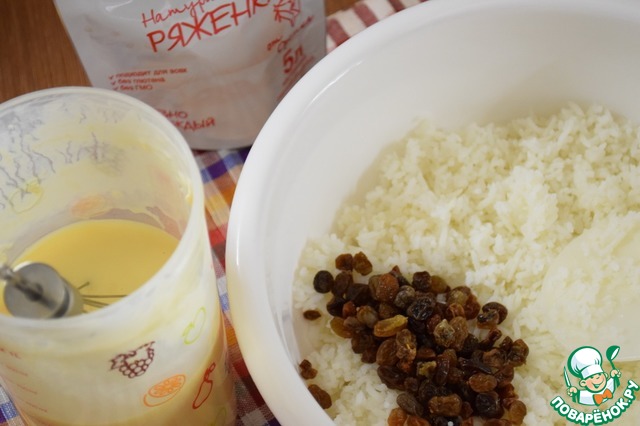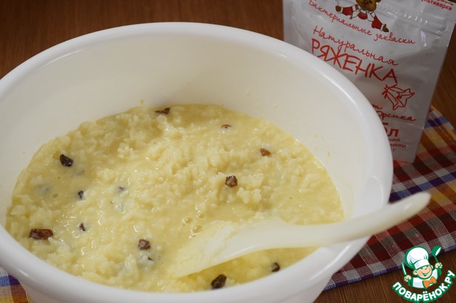 Добавляем ряженку с медом, перемешиваем. Масса должна быть жидкой, т. к. рис еще будет впитывать в себя жидкость.