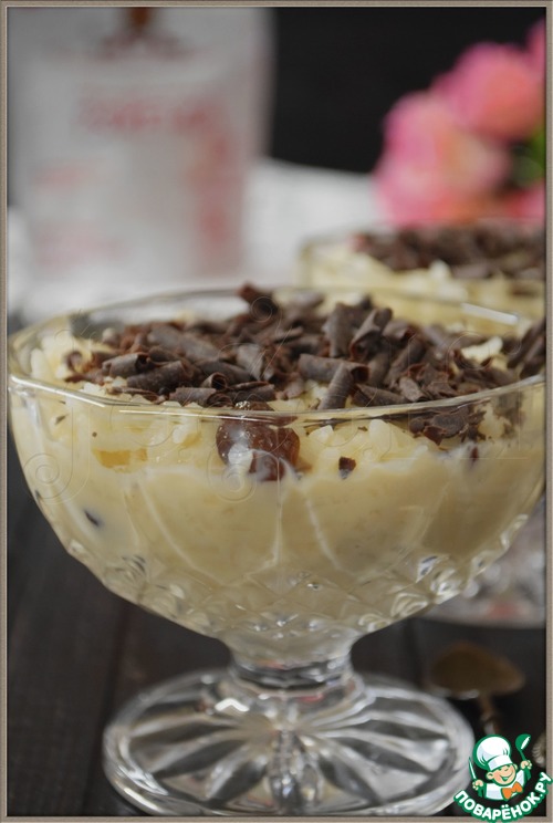 Раскладываем все по креманкам (у меня получилось 4 порции). Убираем в холодильник на 3-4 часа, затем посыпаем шоколадной стружкой и подаем.