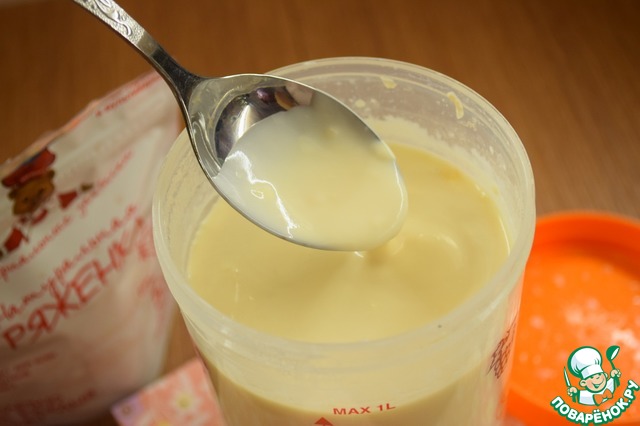 Приготовим ряженку: домашнее топленое молоко (22-24°С) вылить в емкость, в которой будем готовим ряженку, добавить 1 пакет закваски для ряженки от Орсика. Емкость хорошо закрыть крышкой и поболтать из стороны в сторону 2-3 минуты.