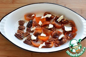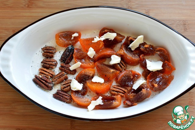 Хурму нарежьте дольками и удалите косточки. Выложите в форму и полейте лимонным соком. Разложите рядом орехи- вкусно делать с пеканом или грецким – посыпьте кардамоном и сахаром. Разложите хлопья масла и запекайте в горячей духовке минут 15 – до карамелизации и румянца. Охладите.