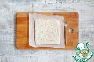 Выньте из морозильника тесто на 10 мин., не больше. Разделите пласты, выложите на застеленный пергаментом противень в нескольких сантиметрах друг от друга. Маленьким острым ножом надсеките тесто по периметру в 1,5 см от краев – у вас получатся как бы «окошки». Центр теста часто наколите ножом, края не трогайте.