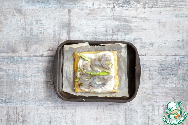 Когда тесто подпечется, выньте противень из духовки, быстро выложите в центр каждого квадрата заливку, в ней слегка утопите спаржу и креветки. Смажьте края теста смесью желтка и сливок. Верните тарты в духовку, запекайте до румяной корочки, примерно 20 мин. Подавайте теплыми.