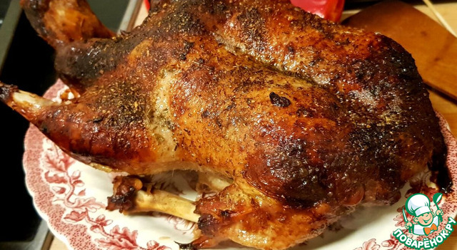 Смесью натереть утку изнутри. Положить утку в форму грудкой вверх. Влить полстакана воды. Готовить утку около 1, 5 часов.