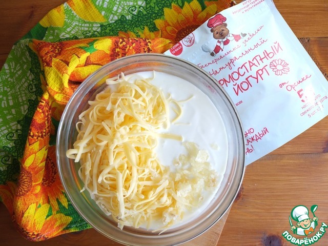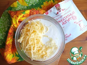 Для соуса смешиваем йогурт, тёртый сыр и чеснок, пропущенный через пресс.