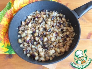 Добавляем баклажан, нарезанный мелким кубиком, обжариваем несколько минут. -