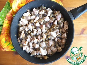 К обжаренным овощам добавляем мелко нарезанную свинину. Обжариваем буквально несколько минут до полуготовности. Солим, перчим.