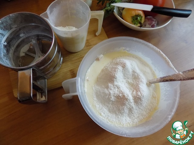 Просеиваем муку. У меня ушло ровно 1 стакан, ёмкостью 250 мл. Замешиваем тесто.