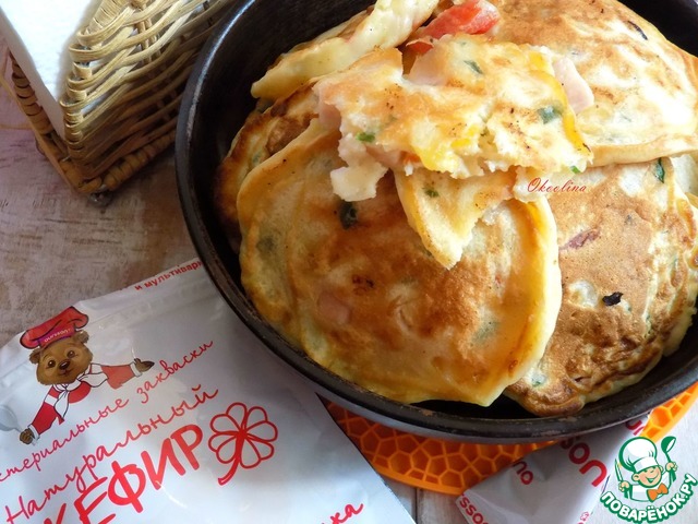 Оладьи на домашнем кефире, приготовленном при помощи закваски Oursson для кефира. В тесто добавлен сыр, ветчина и овощи: перец болгарский, помидор и зелень. Оладьи обжарены на сковороде в подсолнечном масле. Сыр в оладьях подплавился, получился тягучим. На вкус оладьи напоминают вкус пиццы. Оладьи хороши и остывшие.