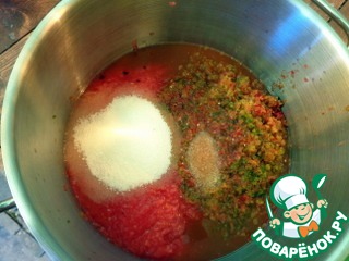 Перцы, помидоры, острый перец, чеснок перекрутить на мясорубке, добавить соль, сахар, уксусную эссенцию, растительное масло и кипятить в течении 5 минут.