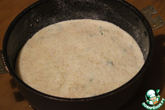 Верх пирога присыпать кунжутом. Форму поставить в разогретую до 180С духовку. Выпекать 35-40 мину (ориентируйтесь на свою духовку)