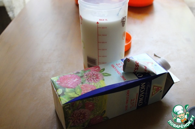 В простерилизованный стакан вылить 1 л молока комнатной температуры. Добавить 1 пакет закваски для кефира от Орсик, хорошо перемешать. Закрыть крышкой.