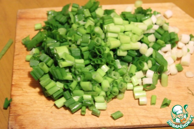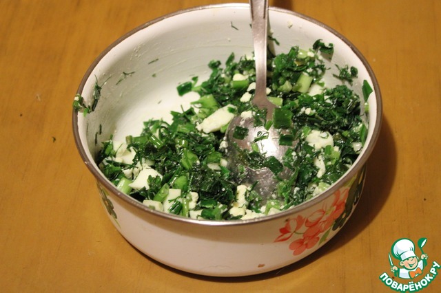 Для начинки зелень (у меня укроп, петрушка, зелёный лук) вымыть, обсушить, мелко нарезать.