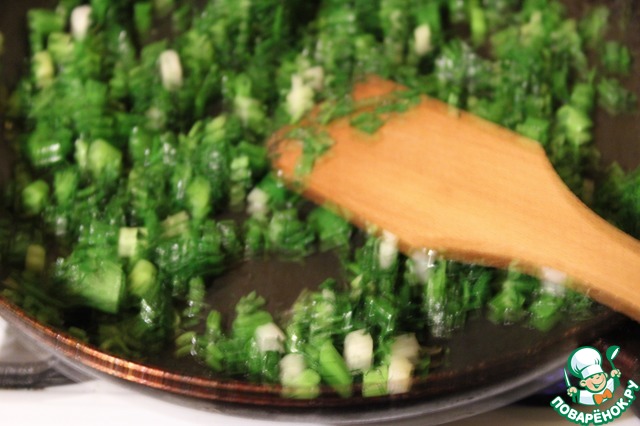 В сковороде разогреть растительное масло, выложить зелень и пассеровать 3-5 минут. Присолить немного. Охладить.