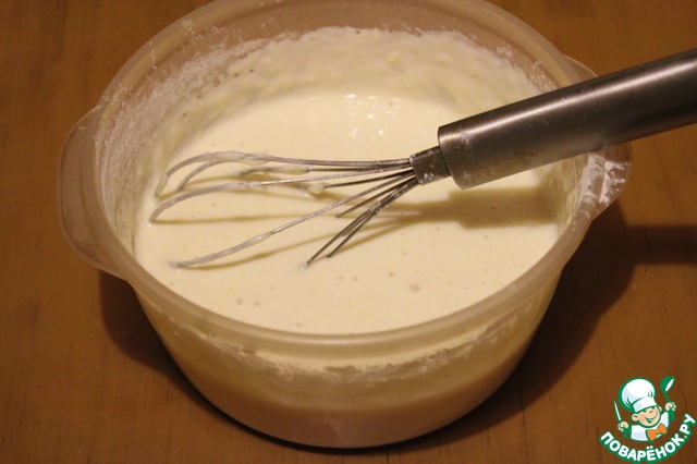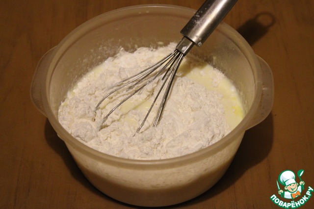 Взбить яйца, смешать с растопленным маслом и кефиром. -