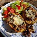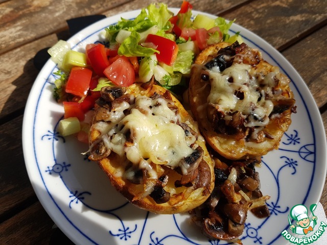 Когда грибочки готовы, уже поспела и картошечка. Достаем ее из аэрогриля. Ложкой немного выгребаем серединку из картошки и кладем ее в мисочку для начинки. Добавляем грибы, майонез, чеснок и перемешиваем.
