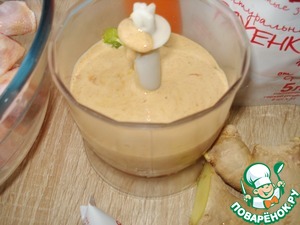 Для маринада возьмем стакан ряженки, добавим порошок карри, измельченный чеснок, корень имбиря и порезанный острый перчик. Добавим соевый соус, томатную пасту и соль по вкусу.