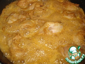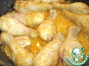 В разогретую сковородку ( казан) добавляем растительное масло и кладем нашу курочку вместе с маринадом.