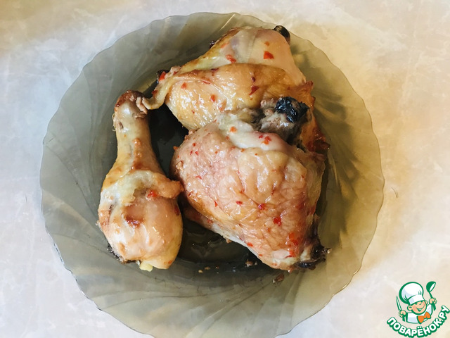 Обильно польем нашу курочку маринадом и оставим мариноваться под крышкой в прохладном месте часа на 4 ( можно и больше), чтобы оно напиталось вкусами и ароматами.