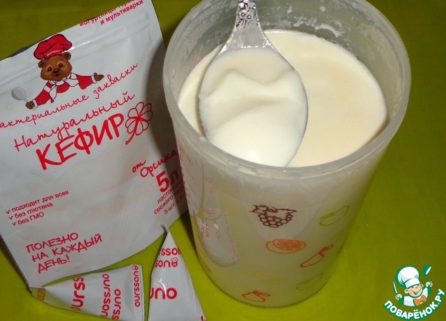 Берем один пакетик 3 г и 1 литр теплого молока. Всыпаем закваску в емкость для сквашивания, заливаем молоком и размешиваем.
