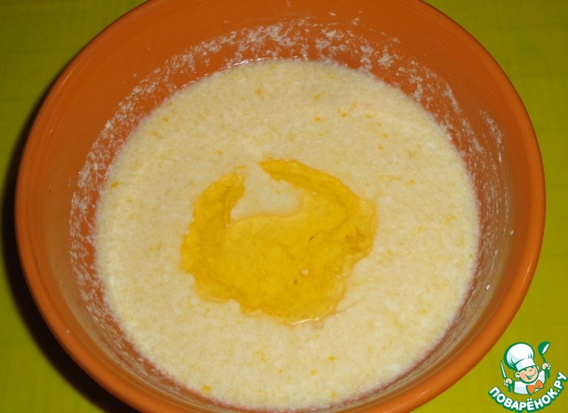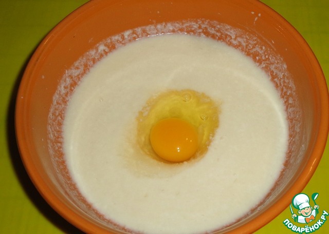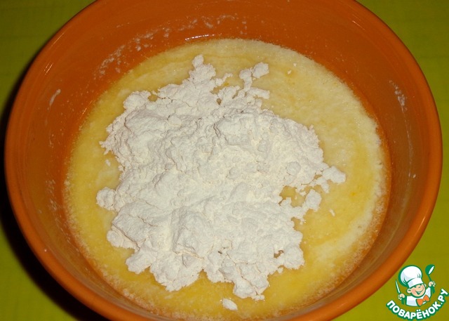 Теперь насыпаем муку, тесто должно быть, как для обычных оладьев.