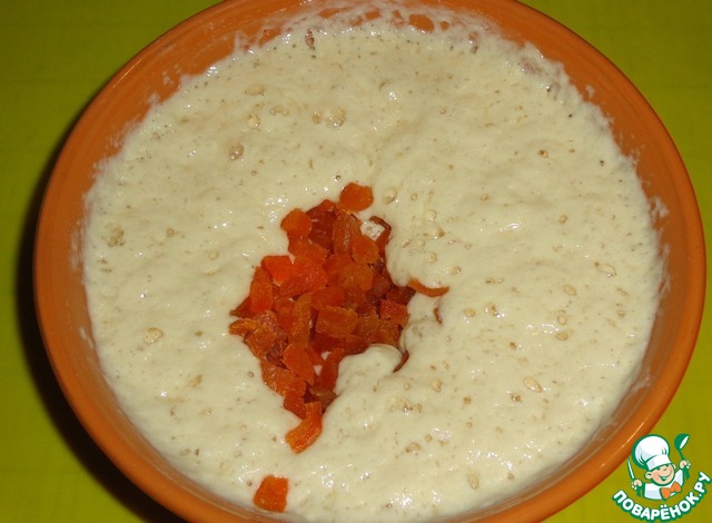 Курагу режем мелко и добавляем в подошедшее тесто. Перемешиваем.