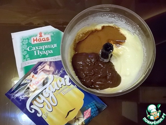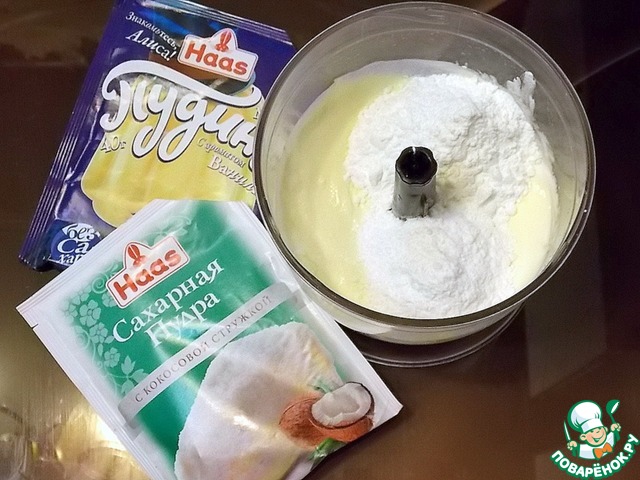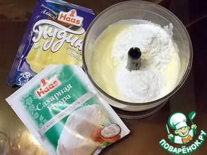 Добавить сахарную пудру с кокосовой стружкой и ванильный пудинг ТМ "HAAS", взбить снова до однородной массы.
