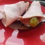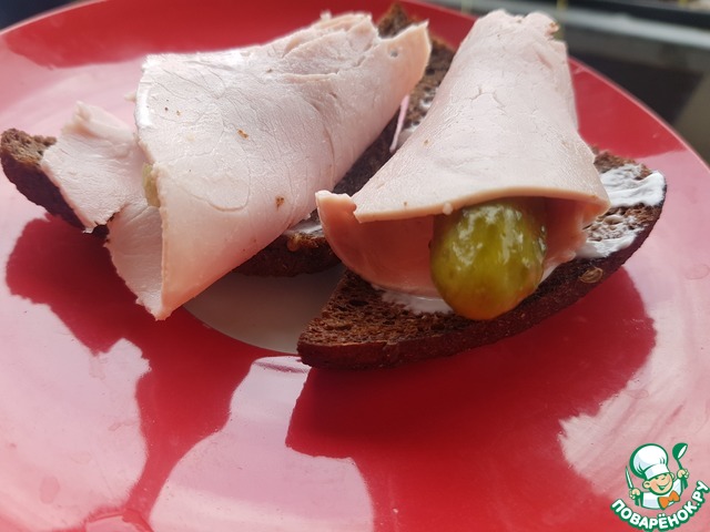 Нарезаем ветчину и соленые огурчики так чтобы их можно было уложить на бутерброд. И на конец делаем: кусочек жареного, черного хлеба смазываем майонезом с чесноком, ложем ветчину и сверху огурчик. Есть лучше холодными!