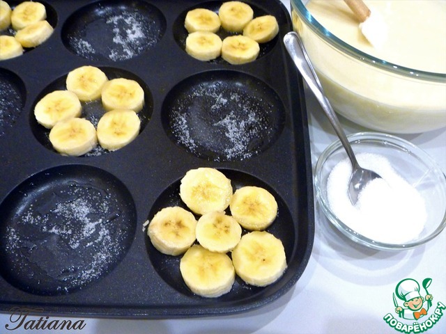 в каждую ячейку выложите банановые "шайбочки", поверх бананов тесто (~ 2 ст. л.). Бананы должны быть полностью покрыты тестом. -