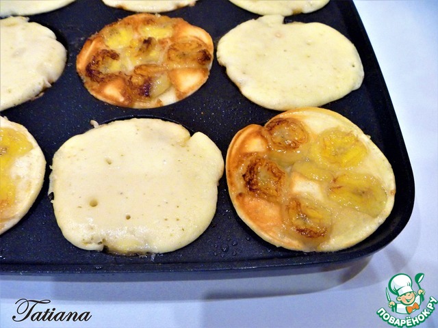 Оладьи с припеком удобнее жарить на сковороде с порционными ячейками, или на очень маленькой сковороде, так как тесто для оладий имеет не очень густую консистенцию, чтобы банановый припек, не "утонул" в более объемном тесте.