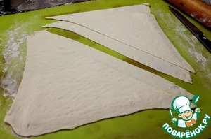 6. Стол присыпать мукой, раскатать без дрожжевое тесто в длину. Катаем в одном направлении, чтобы сложив тесто пополам получилось 2 квадрата. Разрезать тесто на два квадрата, а затем каждый квадрат наискосок. Получится четыре треугольника.