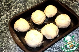 8. Выложить их на смазанный маслом противень. Смазать каждый персик взбитым яйцом. Выпекать 40 - 50 минут при температуре 200 С.