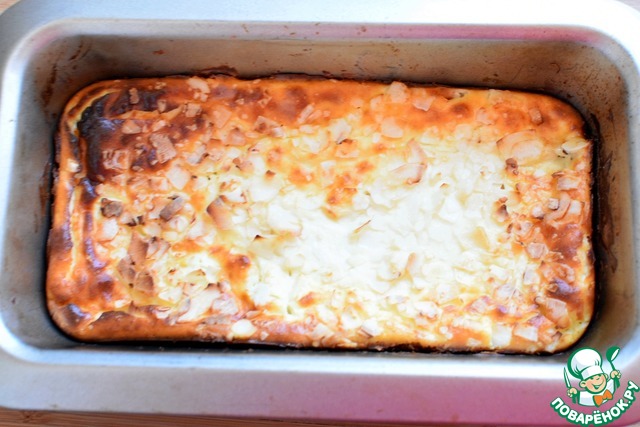 Выложите сверху творожную смесь. При желании можно посыпать сверху кокосовой стружкой или орехами.