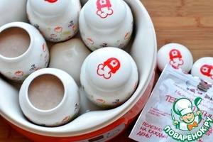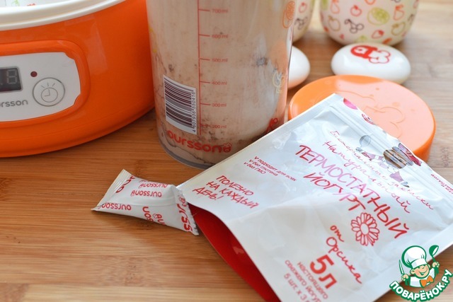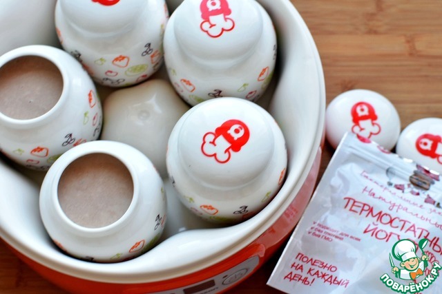 Смешайте слегка подогретое молоко с какао напитком и хорошо взбейте до полного растворения. Добавьте концентрированное молоко, перемешайте. Всыпьте закваску для йогурта от Ourssen и тщательно размешайте.