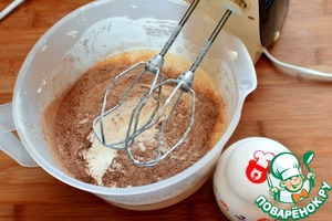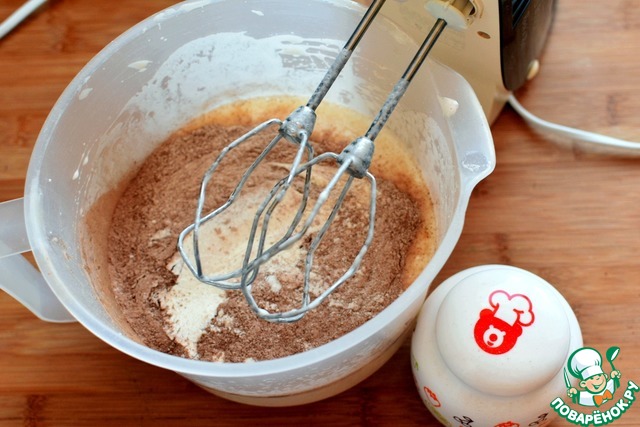 Добавьте йогурт и просеянную с какао, солью и содой муку. Перемешайте тесто, влейте бальзамический уксус и еще раз легко перемешайте.