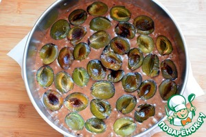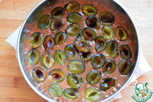 Перелейте тесто в подготовленную разъемную форму и уложите сверху половинки слив разрезом кверху.