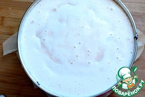 Для пенки взбейте в пену яйцо с сахаром. Добавьте йогурт и крахмал, аккуратно перемешайте лопаткой. Отдельно взбейте белок с лимонным соком в крутую пену и подмешайте в заливку.