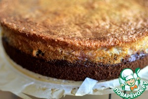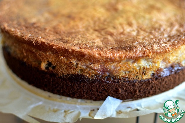 Пирог должен хорошо подняться и быть почти готовым, края уже начнут немного отставать. Залейте его пенкой и допекайте при 160 градусах до румяной подсохшей корочки.