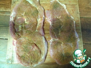 Мясо для лангета нарезать длинными и не толстыми кусками, похожими на язычки, посыпать приправой и хорошо отбить.