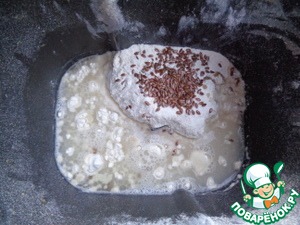 В ведро хлебопечки загрузить дрожжи, оба вида муки, соль, сахар, семена льна, растительное масло и холодную воду.