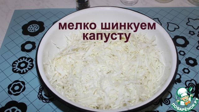Готовим начинку. Мелко шинкуем капусту. Заливаем капусту кипятком и оставляем на 5 минут. После промываем капусту в холодной воде и отжимаем.